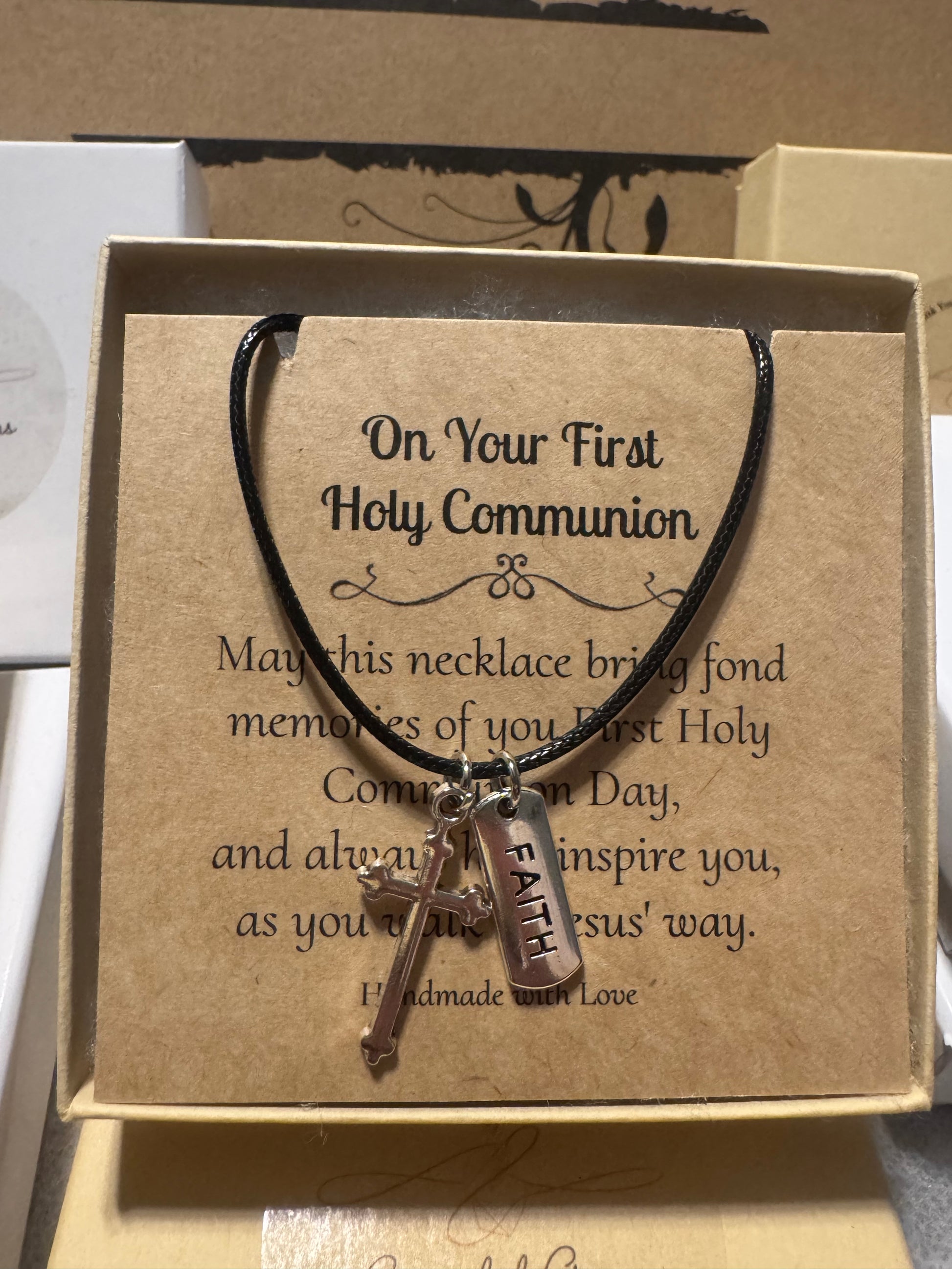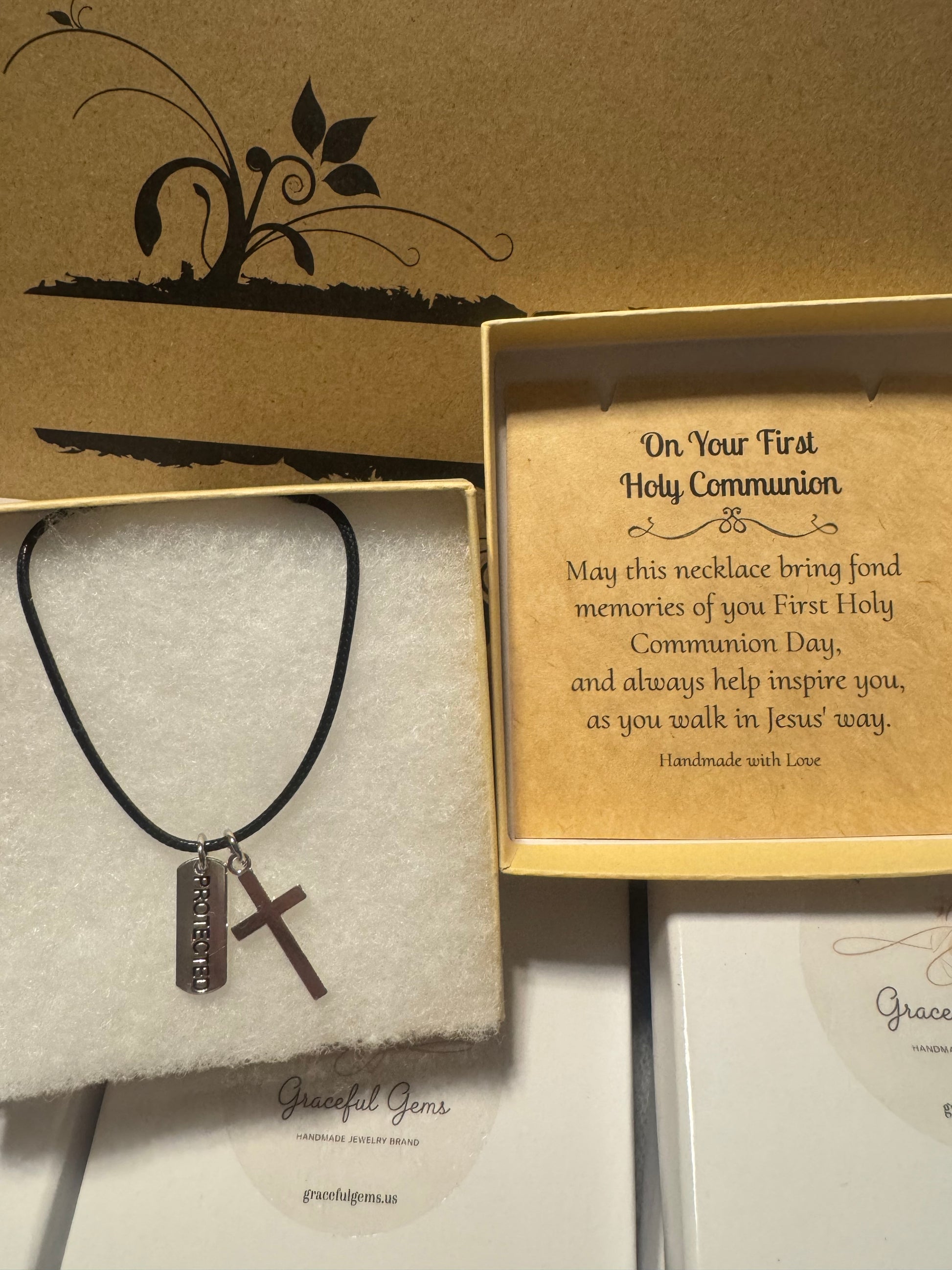 This black cord necklace features a cross pendant with an inspirational charm. This necklace makes a statement of faith and serves as a beautiful reminder of spiritual strength. Perfect for everyday wear or special occasions, this necklace will add a meaningful touch to any outfit. Message us to customize!