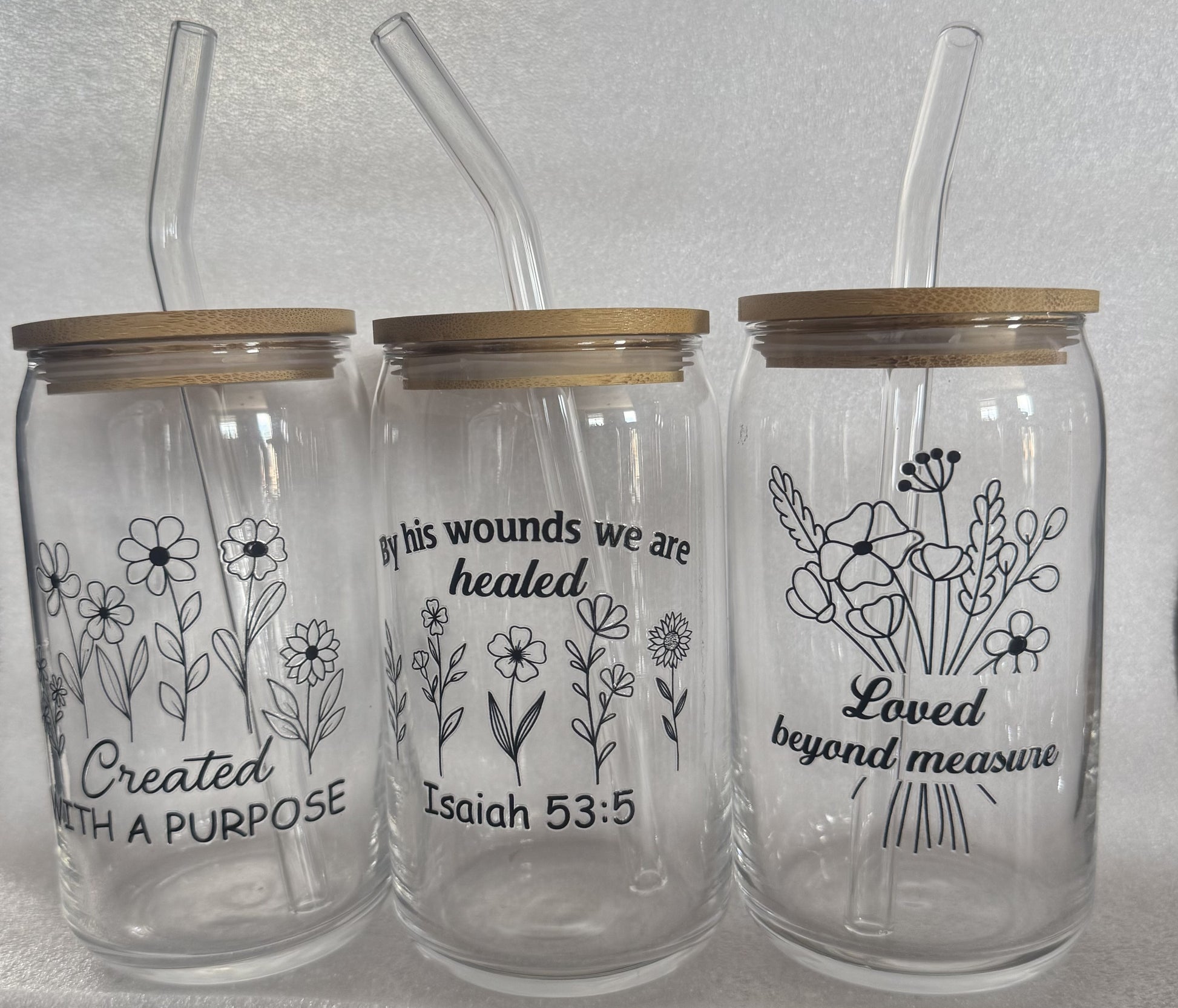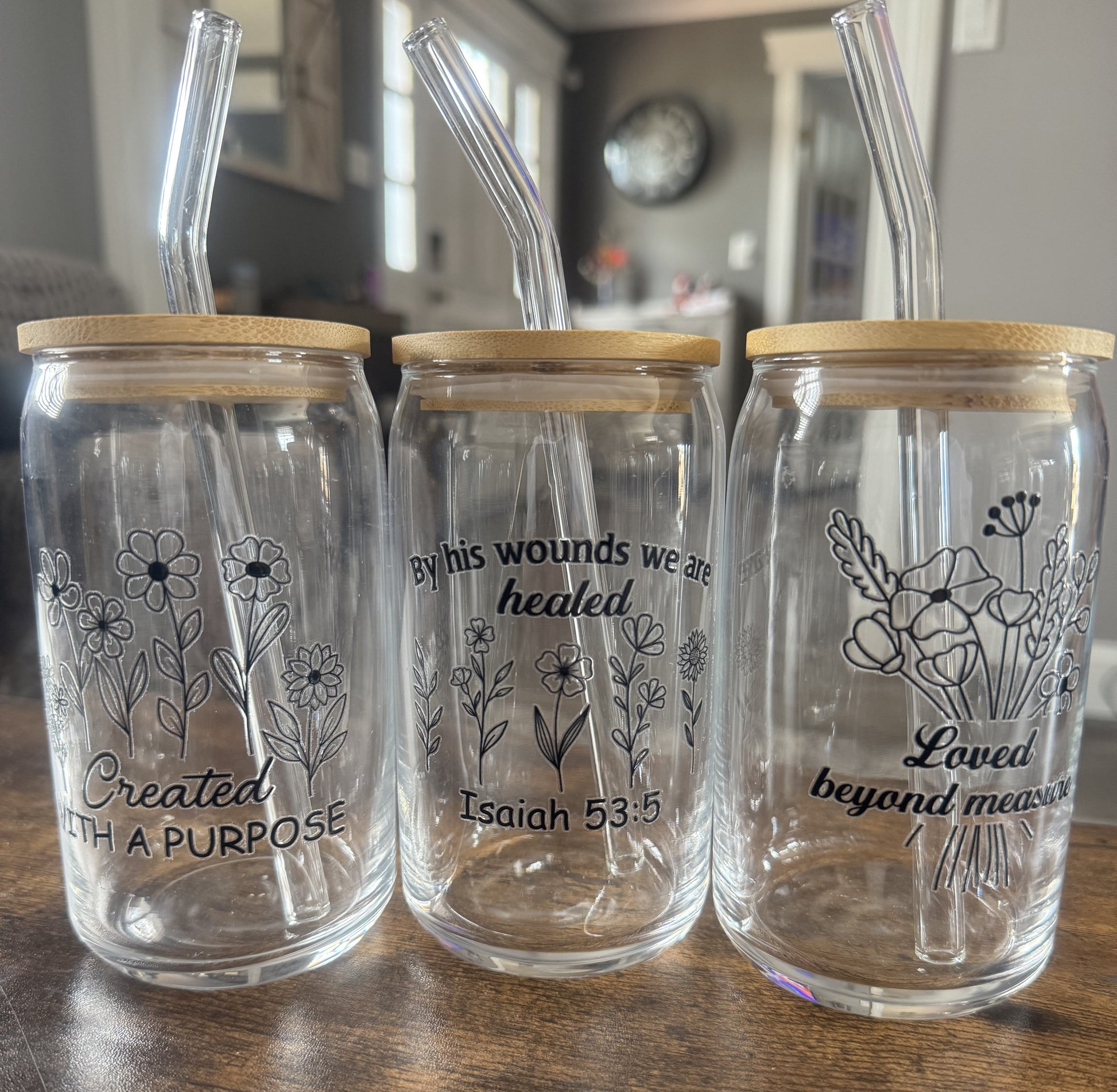 Elevate your beverage experience with our Glass Tumblers featuring inspirational quotes and bible verses. Made with bamboo lids and glass straws for a sustainable and stylish choice. Perfect for Easter gifts, fill them with candy, money, or gift cards for a practical yet meaningful option. Enjoy the joy of giving without the traditional basket mess.